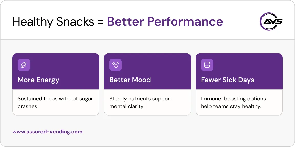 Research consistently shows that access to nutrient-dense snacks improves focus, memory, and mood. Think whole-grain chips, fruit snacks, mixed nuts, and protein-packed bars—items that deliver steady energy without sugar crashes.