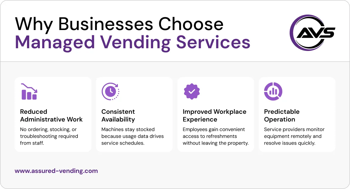 Many businesses assume vending machines require internal management — ordering snacks, fixing problems, and handling payments.