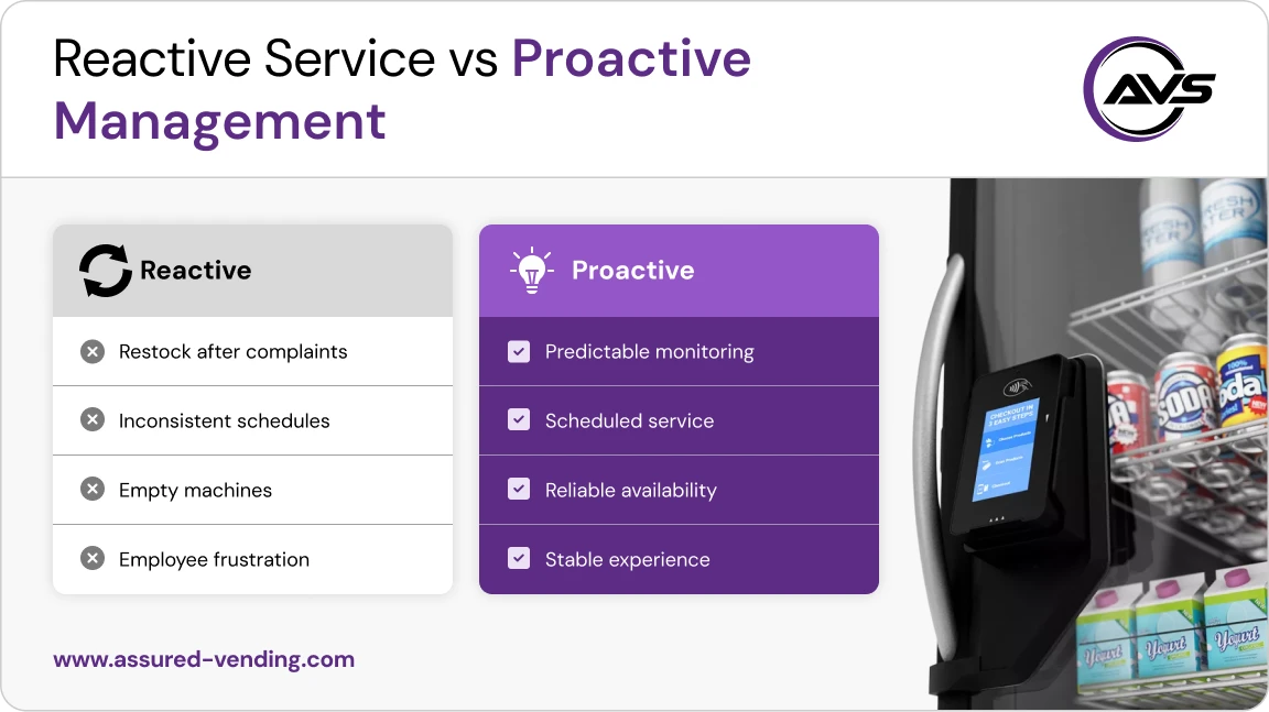 Modern vending relies on predictable monitoring and scheduled service, not problem-based visits.